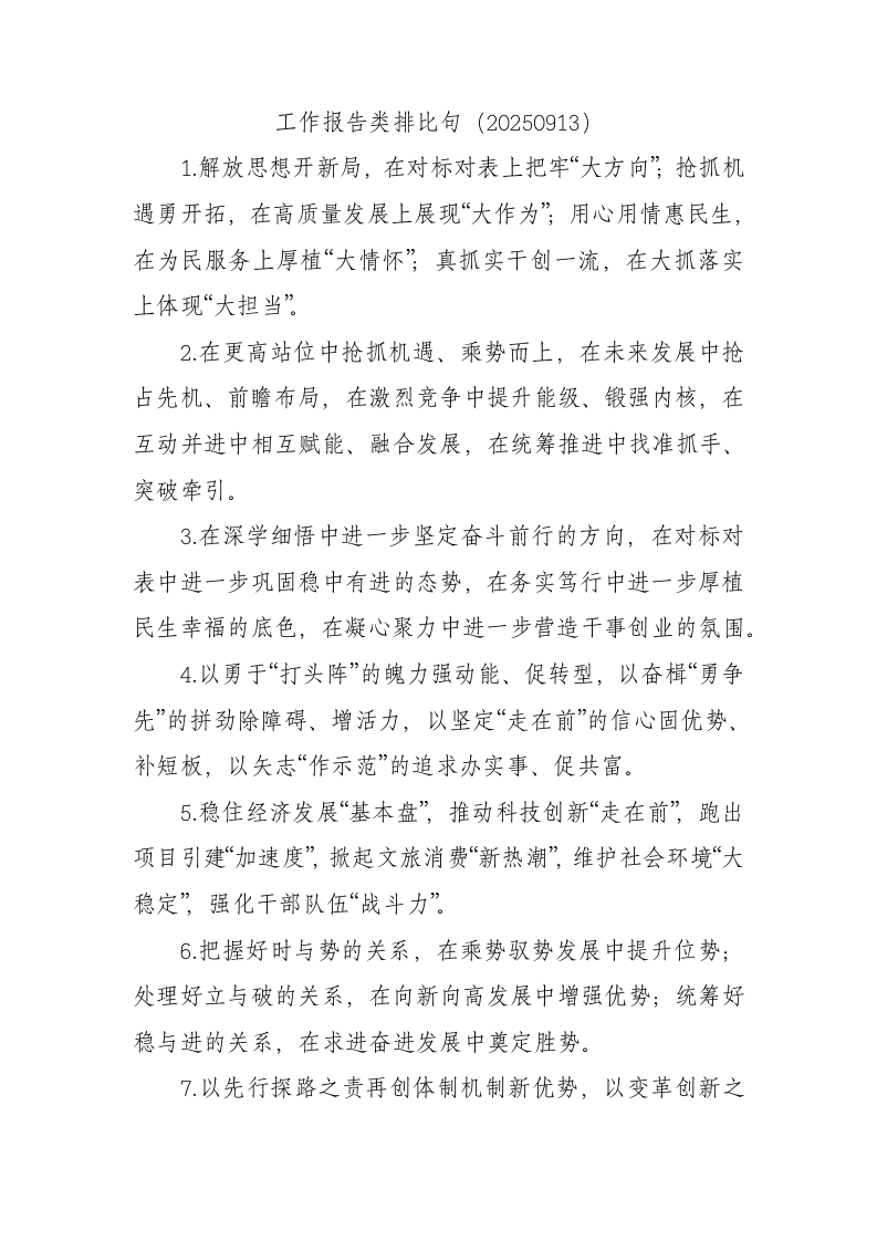 工作报告类排比句(20250913)1.解放思想开新局,在对标对表上把牢“大方向?抢抓机遇勇开拓,在高质量发展上展现“大作为”;用心用情惠民生,在为民服务上厚植“大情怀?真抓实干创一流,在大抓落实上体现“大担当”2.在更高站位中抢抓机遇、乘势而上,在未来发展中抢占先机、前瞻布局,在激烈竞争中提升能级、锻强内核,在互动并进中相互赋能、融合发展,在统筹推进中找准抓手、突破牵引。3.在深学细悟中进一步坚定奋斗前行的方向,在对标对表中进一步巩固稳中有进的态势,在务实笃行中进一步厚植民生幸福的底色,在凝心聚力中进一步营造干事创业的氛围。4.以勇于“打头阵”的魄力强动能、促转型,以奋楫“勇争先”的拼劲除障碍、增活力,以坚定“走在前”的信心固优势、补短板,以矢志“作示范”的追求办实事、促共富。5.稳住经济发展“基本盘”,推动科技创新“走在前”跑出项目引建“加速度”掀起文旅消费“新热潮”,维护社会环境“大稳定”强化干部队伍“战斗力”6.把握好时与势的关系,在乘势驭势发展中提升位势;处理好立与破的关系,在向新向高发展中增强优势;统筹好稳与进的关系,在求进奋进发展中奠定胜势。7.以先行探路之责再创体制机制新优势,以变革创新之力激活产业发展新动能,以为民造福之举推动共富善治新提升,以守根护脉之志增强D的建设新成效。8.拼发展争进位、全力提升能级实力,扬优势赋动能、大力彰显文化魅力,抓改革破瓶颈、奋力增强内生动力,扛重担强作风、着力凝聚干事合力。9机制创新“破梗阻”,以精准督战激活发展引擎;靶向攻坚“补短板”以问题导向破解发展难题;实绩比拼“激担当,以实干导向锤炼干部队伍。10.以“挑大梁扛重担”的责任感推进经济稳进提质,以“勇争先走在前”的使命感深化改革系统重塑,以“等不起慢不得”的紧迫感强化除险保安。11.把创新驱动作为核心引擎,把改革开放作为关键一招,把服务大局作为应尽之责,把共同富裕作为目标追求,把抓好D建作为最大政绩。12.增强了“一心向D、对标对表”的定力,增强了“一往无前、突破突围”的发展定力,增强了“一抓到底、担当担责”的实干定力。13.量质齐升、竞相发展的强劲势头,改革攻坚、锐意创新的动力活力,比学赶超、争先创优的浓厚氛围,真抓实干、大抓落实的过硬作风。14.在察势顺势驭势中把握政策机遇,在盘账算账对账中找准提升方向,在知难克难破难中拓展发展空间,在知责担