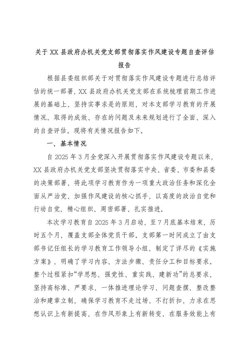 关于X县政府办机关党支部贯彻落实作风建设专题自查评估报告根据县委组织部关于对贯彻落实作风建设专题进行总结评估的统一部署,X县政府办机关党支部在系统梳理前期工作进展的基础上,坚持实事求是的原则,对本支部学习教育的开展情况、取得的成效、存在的问题及未来规划进行了全面、深入的自查评估。现将有关情况报告如下。一、基本情况自2025年3月全党深入开展贯彻落实作风建设专题以来,X县政府办机关党支部坚决贯彻落实中央、省委、市委和县委的决策部署,将此项学习教育作为一项重大政治任务和深化全面从严治党、加强作风建设的核心抓手,以高度的政治自觉和行动自觉,精心组织、周密部署、扎实推进。本次学习教育自2025年3月启动,至7月底基本结束,历时五个月,覆盖支部全体党员干部。支部第一时间成立了由支部书记任组长的学习教育工作领导小组,制定了详尽的《实施方案》,明确了学习内容、方法步骤、责任分工和目标要求。整个过程紧扣“学思想、强党性、重实践、建新功”的总要求,坚持高标准、严要求,一体推进理论学习、问题查摆、整改整治和建章立制,确保学习教育不走过场、不打折扣,力求在思想认识上有新提高,在作风形象上有新转变,在服务效能上有新突破。二、做法与成效学习教育期间,支部坚持守正创新,多措并举,推动中央八项规定精神内化于心、外化于行,取得了阶段性显著成效。(一)主要做法1.坚持高位统筹,层层压实责任。支部始终将学习教育摆在突出位置,召开专题动员部署会,传达上级精神,统一思想认识。支部书记认真履行“第一责任人”职责,带头领学促学、带头查摆问题、带头整改落实,先后主持召开支委会、支部党员大会等会议8次,专题研究部署学习教育工作。班子成员严格落实“一岗双责”,加强对分管领域党员干部的督促指导,形成了“书记带头抓、班子合力抓、党员全员学”的良好局面。2.创新学习形式,筑牢思想根基。为破解学习“形式单一、效果不佳”的难题,支部着力构建“集中+自学、线上+线下、理论+实践”的立体化学习模式。一是深化集中研学。依托“三会一课”、主题党日等载体,组织全体党员原原本本、逐字逐句学习《总书记关于加强党的作风建设论述摘编》、中央八项规定及其实施细则精神和省、市、县相关规定。累计开展专题学习12次,举办读书班2期,支部书记、委员带头讲授专题党课4次,确保核心要义入脑入心。二是丰富线上助学。充分利用AAA公众号、学习强国等新媒体平台,定期推送相关政策解读、权威