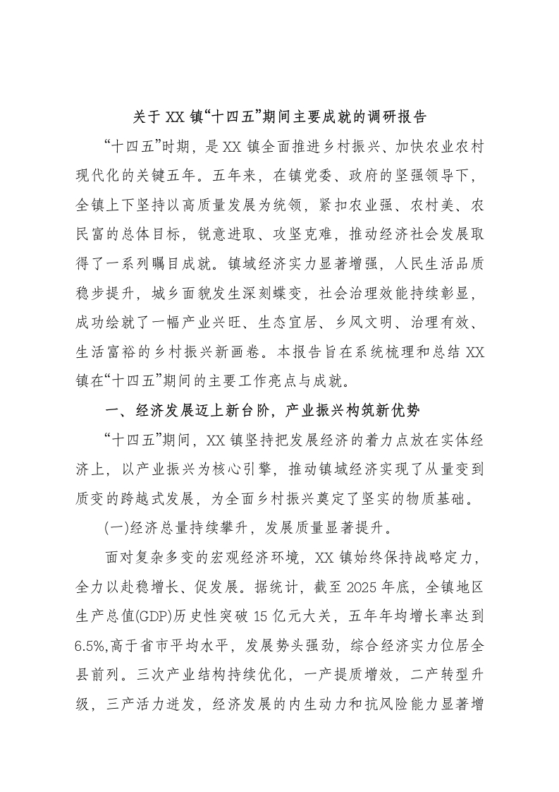 关于X镇“十四五”期间主要成就的调研报告“十四五”时期,是X镇全面推进乡村振兴、加快农业农村现代化的关键五年。五年来,在镇党委、政府的坚强领导下,全镇上下坚持以高质量发展为统领,紧扣农业强、农村美、农民富的总体目标,锐意进取、攻坚克难,推动经济社会发展取得了一系列瞩目成就。镇域经济实力显著增强,人民生活品质稳步提升,城乡面貌发生深刻蝶变,社会治理效能持续彰显,成功绘就了一幅产业兴旺、生态宜居、乡风文明、治理有效、生活富裕的乡村振兴新画卷。本报告旨在系统梳理和总结X镇在“十四五”期间的主要工作亮点与成就。一、经济发展迈上新台阶,产业振兴构筑新优势“十四五”期间,X镇坚持把发展经济的着力点放在实体经济上,以产业振兴为核心引擎,推动镇域经济实现了从量变到质变的跨越式发展,为全面乡村振兴奠定了坚实的物质基础。(一)经济总量持续攀升,发展质量显著提升。面对复杂多变的宏观经济环境,XX镇始终保持战略定力,全力以赴稳增长、促发展。据统计,截至2025年底,全镇地区生产总值(GDP)历史性突破15亿元大关,五年年均增长率达到6.5%,高于省市平均水平,发展势头强劲,综合经济实力位居全县前列。三次产业结构持续优化,一产提质增效,二产转型升级,三产活力迸发,经济发展的内生动力和抗风险能力显著增强。全镇财政收入稳步增长,为民生改善和基础设施建设提供了有力保障,发展的成果更多、更公平地惠及了全镇人民。(二)特色产业集群化发展,富民效应日益凸显。X镇立足本地独特的资源禀赋和生态优势,大力培育和发展特色农业产业,形成了以有机果蔬种植和生态养殖为主导的现代农业产业体系。通过政策引导、资金扶持和技术服务,成功培育省级以上畜牧龙头企业1家,有力带动了产业链上下游协同发展。全镇累计发展家庭农场、农民专业合作社86家,新型农业经营主体成为引领现代农业发展的中坚力量。农产品深加工能力显著增强,深加工率由“十三五”末的不足40%提升至65%,有效延长了产业链、提升了价值链。通过“龙头企业+合作社+农户”的利益联结机制,五年间累计带动村民年人均增收超过1.2万元。在品牌建设方面,XX镇着力打造“一村一品、一村一特”的产业格局,重点培育了“XX村特色浆果、草莓、香瓜”“XX村葡萄”以及“X村、XX村肉牛养殖”等一批具有市场竞争力的特色农产品品牌。这些品牌不仅提升了农产品的附加值,更通过订单农业、就近务工等方式,累计带动周边40余户农户实现户均增收5000元以上,让农民在产业链中分享更多收益。进入2025年,产业升级步伐进一步加快。X村在巩固特色种植优势的基础上,敏锐捕捉市场新需求,积极拓展产业边