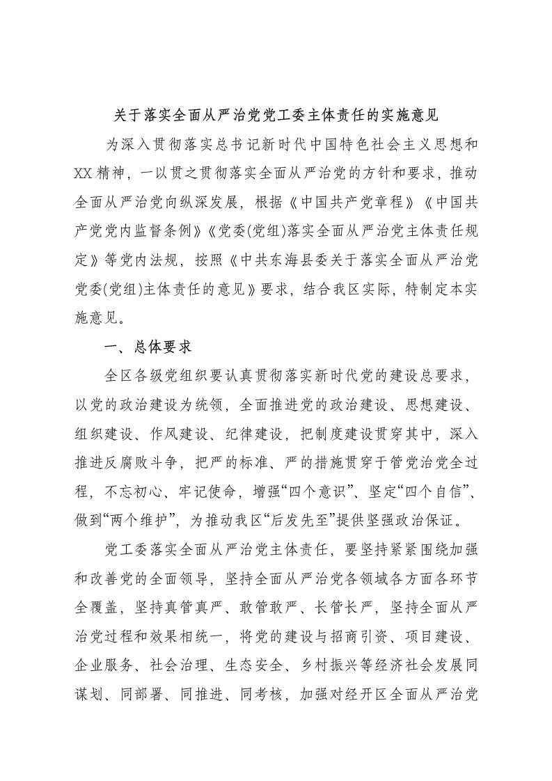 关于落实全面从严治党党工委主体责任的实施意见为深入贯彻落实总书记新时代中国特色社会主义思想和X精神,一以贯之贯彻落实全面从严治党的方针和要求,推动全面从严治党向纵深发展,根据《中国共产党章程》《中国共产党党内监督条例》《党委(党组)落实全面从严治党主体责任规定》等党内法规,按照《中共东海县委关于落实全面从严治党党委(党组)主体责任的意见》要求,结合我区实际,特制定本实施意见。一、总体要求全区各级党组织要认真贯彻落实新时代党的建设总要求,以党的政治建设为统领,全面推进党的政治建设、思想建设、组织建设、作风建设、纪律建设,把制度建设贯穿其中,深入推进反腐败斗争,把严的标准、严的措施贯穿于管党治党全过程,不忘初心、牢记使命,增强“四个意识”、坚定“四个自信”、做到“两个维护”,为推动我区“后发先至”提供坚强政治保证。党工委落实全面从严治党主体责任,要坚持紧紧围绕加强和改善党的全面领导,坚持全面从严治党各领域各方面各环节全覆盖,坚持真管真严、敢管敢严、长管长严,坚持全面从严治党过程和效果相统一,将党的建设与招商引资、项目建设、企业服务、社会治理、生态安全、乡村振兴等经济社会发展同谋划、同部署、同推进、同考核,加强对经开区全面从严治党各项工作的领导,研究解决影响全面从严治党的突出问题。纪工委、各内设机构在本部门落实全面从严治党主体责任,党的基层组织落实全面从严治党主体责任,参照相关规定和本《实施意见》执行。二、责任内容党工委要把全面从严治党作为最根本的职责立起来,坚持思想从严、执纪从严、治吏从严、作风从严、反腐从严,不断推动全面从严治党迈上新台阶。(一)领导班子集体责任1.加强组织领导。党工委发挥总揽全局、把方向、管大局、保落实的领导作用,坚决贯彻落实党中央和省、市、县委关于全面从严治党部署要求,研究制定责任清单,目标要求和具体措施,明确领导班子成员职责分工,抓好任务分解,加强监督检查,推动各项部署要求落到实处。党工委每半年至少召开1次会议专题研究全面从严治党工作,分析研判全面从严治党形势,提出加强和改进的措施。2.加强党的政治建设。坚决维护以总书记同志为核心的党中央权威和集中统一领导,始终同党中央保持高度一致,全面落实新时代党的建设总要求,严明政治纪律和政治规矩,严格执行新形势下党内政治生活若干准则,落实民主生活会、组织生活会“十不准”规定,发展积极健康的党内政治文化,营造风清