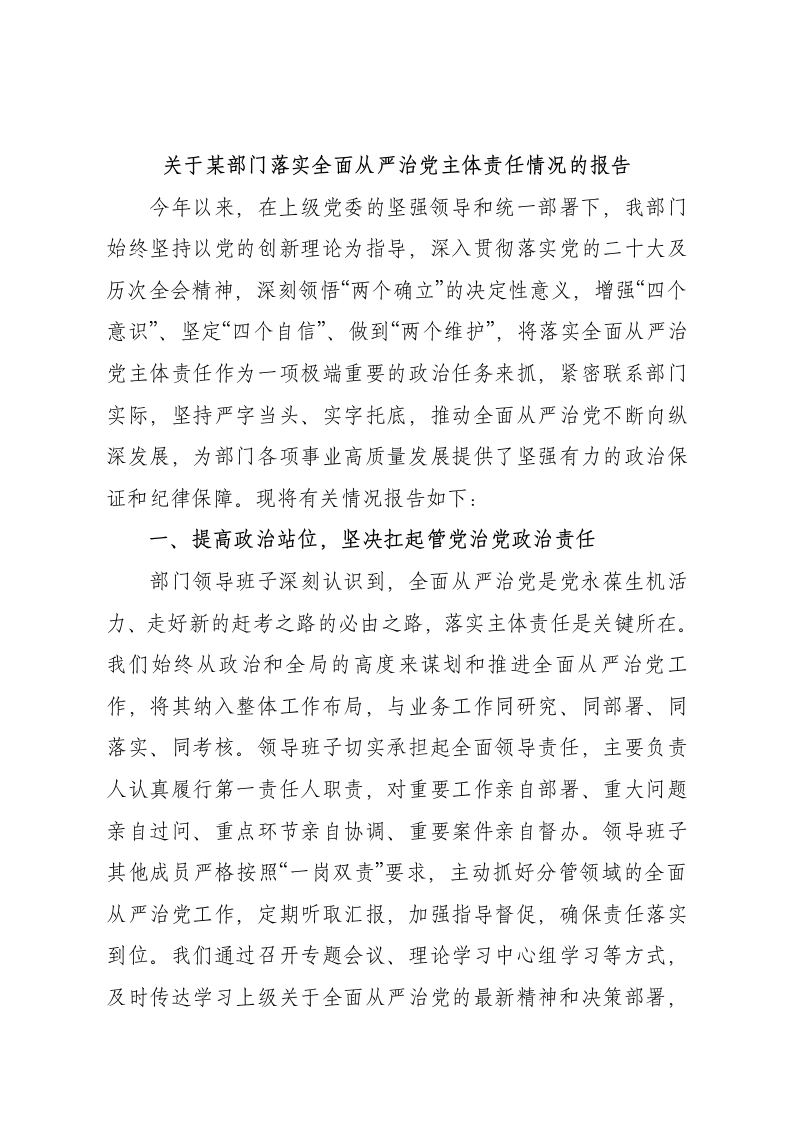 关于某部门落实全面从严治党主体责任情况的报告今年以来,在上级党委的坚强领导和统一部署下,我部门始终坚持以党的创新理论为指导,深入贯彻落实党的二十大及历次全会精神,深刻领悟“两个确立”的决定性意义,增强“四个意识”、坚定“四个自信”、做到“两个维护”,将落实全面从严治党主体责任作为一项极端重要的政治任务来抓,紧密联系部门实际,坚持严字当头、实字托底,推动全面从严治党不断向纵深发展,为部门各项事业高质量发展提供了坚强有力的政治保证和纪律保障。现将有关情况报告如下:一、提高政治站位,坚决扛起管党治党政治责任部门领导班子深刻认识到,全面从严治党是党永葆生机活力、走好新的赶考之路的必由之路,落实主体责任是关键所在。我们始终从政治和全局的高度来谋划和推进全面从严治党工作,将其纳入整体工作布局,与业务工作同研究、同部署、同落实、同考核。领导班子切实承担起全面领导责任,主要负责人认真履行第一责任人职责,对重要工作亲自部署、重大问题亲自过问、重点环节亲自协调、重要案件亲自督办。领导班子其他成员严格按照“一岗双责”要求,主动抓好分管领域的全面从严治党工作,定期听取汇报,加强指导督促,确保责任落实到位。我们通过召开专题会议、理论学习中心组学习等方式,及时传达学习上级关于全面从严治党的最新精神和决策部署,不断深化对全面从严治党长期性、复杂性、艰巨性的认识,引导全体党员干部切实把思想和行动统一到中央要求上来,不断增强落实主体责任的政治自觉、思想自觉和行动自觉。我们坚持问题导向,对照上级巡视巡察、督查考核反馈的意见,以及自身查摆发现的问题,深刻剖析根源,制定整改措施,逐项对账销号,以整改的实际成效推动主体责任落细落实。二、深化理论武装,筑牢拒腐防变的思想根基我们始终把思想建设作为基础性工程来抓,坚持用党的创新理论凝心铸魂。严格执行“第一议题”制度,将学习领会党中央重要会议精神、重要讲话和指示批示精神作为各类会议的“头道工序”,确保党的理论创新成果第一时间传达学习、贯彻落实。深入开展主题教育,引导党员干部读原著、学原文、悟原理,在学懂弄通做实上下功夫,不断提高马克思主义理论水平和政治能力。加强理想信念教育和党性教育,组织党员干部赴红色教育基地参观学习,重温入党誓词,观看警示教育片,通过正反两方面典型,引导大家筑牢信仰之基、补足精神之钙、把稳思想之舵。高度重视意识形态工作,严格落实意识形态工作责任制,定期分析研判意识形态领域情况,加强对部门所属网站、公众号、出版物等阵地的管理,旗帜鲜明地反对和抵制各种错误思潮,牢牢掌握意识形态工作的领导权和主动权。加强廉洁文化建设,深入开展党纪法规和廉洁从政教育,将廉政谈话作