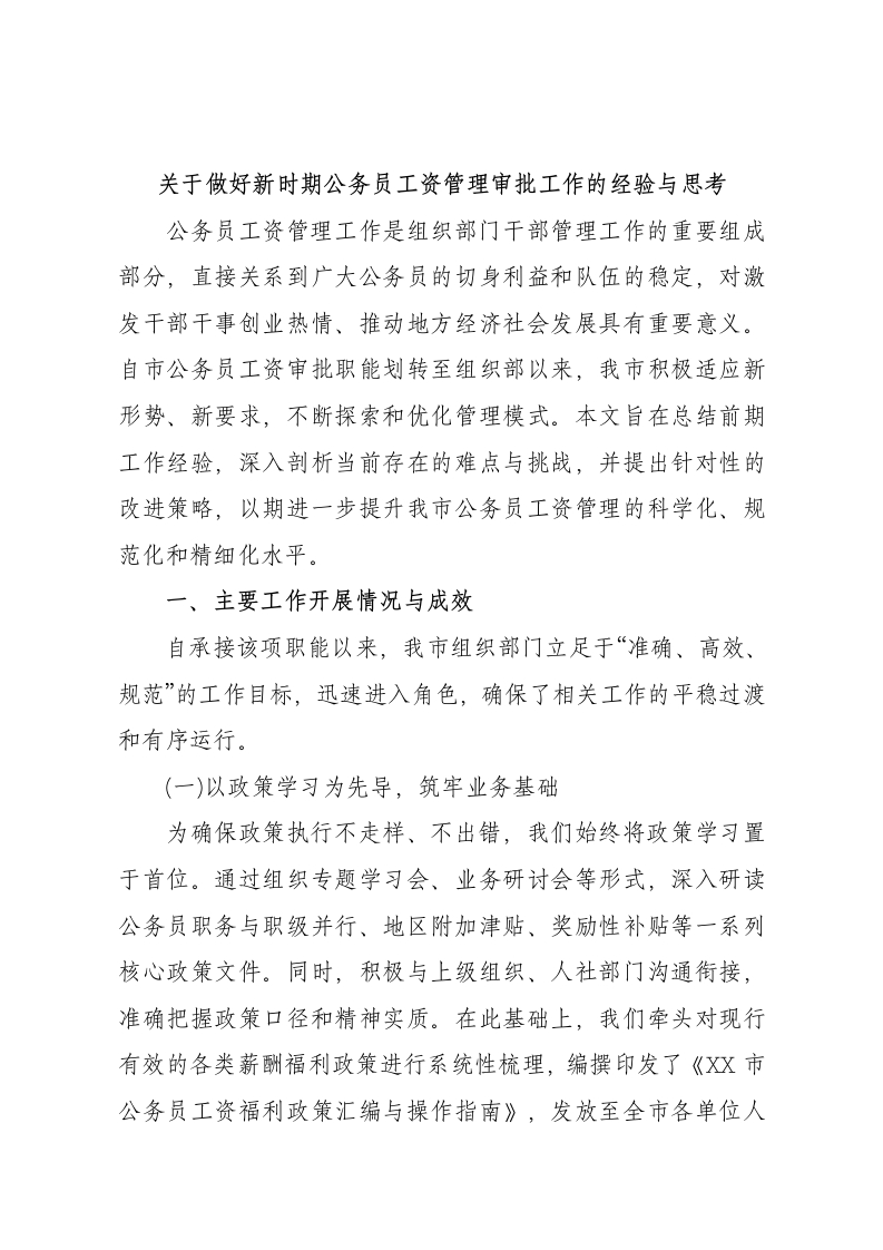 关于做好新时期公务员工资管理审批工作的经验与思考公务员工资管理工作是组织部门干部管理工作的重要组成部分,直接关系到广大公务员的切身利益和队伍的稳定,对激发干部干事创业热情、推动地方经济社会发展具有重要意义。自市公务员工资审批职能划转至组织部以来,我市积极适应新形势、新要求,不断探索和优化管理模式。本文旨在总结前期工作经验,深入剖析当前存在的难点与挑战,并提出针对性的改进策略,以期进一步提升我市公务员工资管理的科学化、规范化和精细化水平。一、主要工作开展情况与成效自承接该项职能以来,我市组织部门立足于“准确、高效、规范”的工作目标,迅速进入角色,确保了相关工作的平稳过渡和有序运行。(一)以政策学习为先导,筑牢业务基础为确保政策执行不走样、不出错,我们始终将政策学习置于首位。通过组织专题学习会、业务研讨会等形式,深入研读公务员职务与职级并行、地区附加津贴、奖励性补贴等一系列核心政策文件。同时,积极与上级组织、人社部门沟通衔接,准确把握政策口径和精神实质。在此基础上,我们牵头对现行有效的各类薪酬福利政策进行系统性梳理,编撰印发了《X市公务员工资福利政策汇编与操作指南》,发放至全市各单位人事干部手中,有效解决了基层单位因经办人员更替频繁、业务生疏而导致的政策理解偏差、执行标准不一等问题。(二)以流程规范为核心,提升审批效能我们坚持从源头抓起,严把信息录入关。严格依据干部人事档案,对“三龄两历”等核心信息进行反复核对,确保工资管理系统中的基础数据真实、准确、完整。在工资变动审批环节,我们建立了严格的审核机制,对每一次职务职级晋升、新录用、调动、退休、处分等变动事项,均要求提供完整、合规的依据性文件,并对工资核算表中的项目、标准、金额进行逐一核对,确保每一笔资金调整都有据可查。此外,我们创新建立了全市公务员工资审批电子台账,将所有变动事项的佐证材料扫描归档,实现了审批流程的全程留痕、可追溯、可复核。(三)以精细管理为抓手,优化服务质量为提升管理质效,我们建立了常态化的数据巡查机制,每月定期对工资系统数据进行比对分析,主动排查和预警异常数据。对发现的潜在问题,第一时间与相关单位联系,通过调阅工资档案、核对历史文件等方式予以纠正。在日常工作中,我们全面推行“一次性告知”和“即时办结”服务模式,对前来咨询或办理业务的同志,做到热情接待、耐心解答、高效审核。我们还建立了覆盖全市各单位人事干部的“工资业务工作群”,在人员调动、干部调整、职级晋升等关键时间节点,及时发布工作提