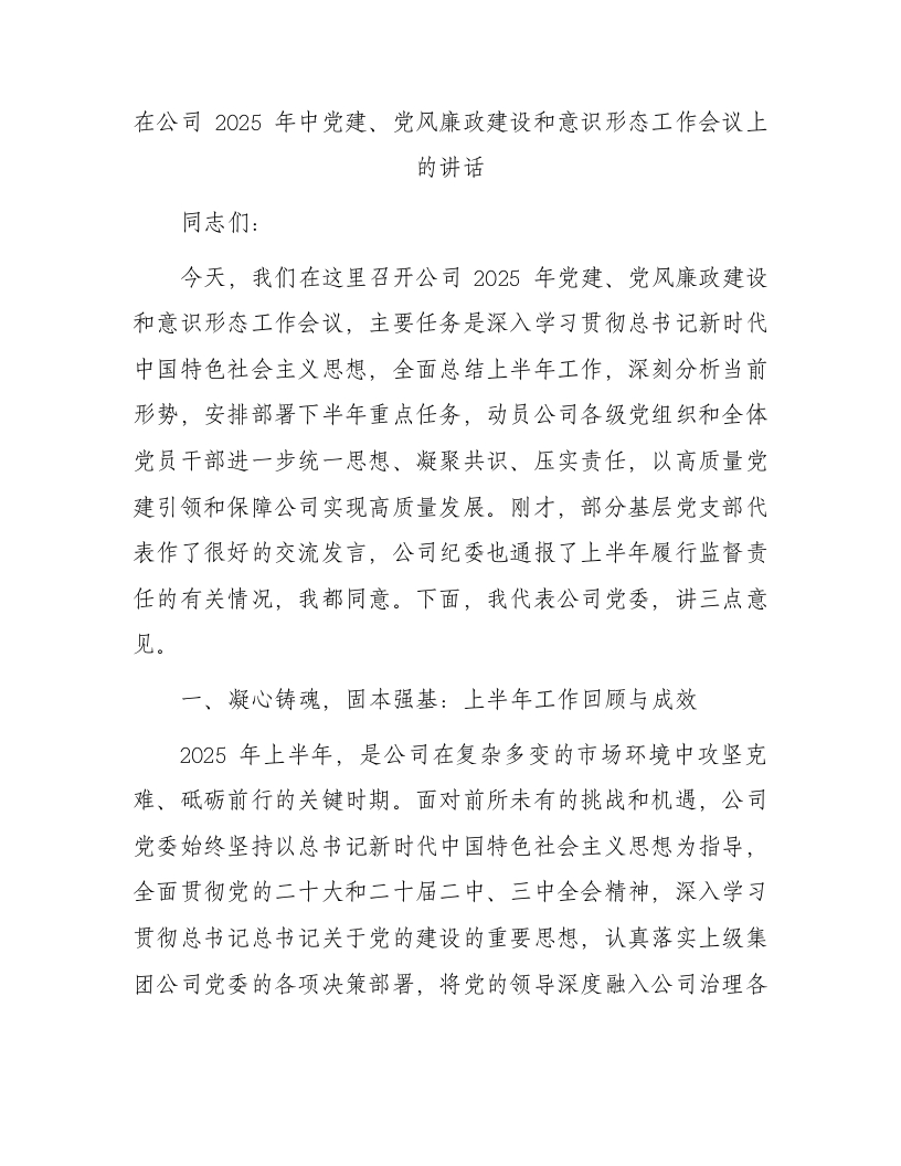 在公司2025年中党建、党风廉政建设和意识形态工作会议上的讲话同志们:今天,我们在这里召开公司2025年党建、党风廉政建设和意识形态工作会议,主要任务是深入学习贯彻总书记新时代中国特色社会主义思想,全面总结上半年工作,深刻分析当前形势,安排部署下半年重点任务,动员公司各级党组织和全体党员干部进一步统一思想、凝聚共识、压实责任,以高质量党建引领和保障公司实现高质量发展。刚才,部分基层党支部代表作了很好的交流发言,公司纪委也通报了上半年履行监督责任的有关情况,我都同意。下面,我代表公司党委,讲三点意见。一、凝心铸魂,固本强基:上半年工作回顾与成效2025年上半年,是公司在复杂多变的市场环境中攻坚克难、砥砺前行的关键时期。面对前所未有的挑战和机遇,公司党委始终坚持以总书记新时代中国特色社会主义思想为指导,全面贯彻党的二十大和二十届二中、三中全会精神,深入学习贯彻总书记总书记关于党的建设的重要思想,认真落实上级集团公司党委的各项决策部署,将党的领导深度融入公司治理各环节,确保了公司发展的正确政治方向。回顾半年来的工作,我们始终坚持把党的建设摆在首位,取得了来之不易的成绩。第一,聚焦“凝心铸魂”,党的政治建设坚强有力。我们始终将政治建设作为党的根本性建设,教育引导全体党员干部深刻领悟“两个确立”的决定性意义,不断增强“四个意识”、坚定“四个自信”、做到“两个维护”。上半年,公司党委理论学习中心组开展专题学习2次,组织各级党组织通过“三会一课”、主题党日等形式,系统学习了总书记总书记关于党的建设、国企改革、作风建设等重要论述,以及总书记在x等地区考察时的重要讲话精神。我们紧跟上级步伐,第一时间传达学习了省委十四届九次全会精神和集团公司x同志在党建专题会议上的讲话要求,确保中央、省委和集团党委的决策部署在公司不折不扣地得到贯彻执行。通过持续的理论武装,广大党员干部的政治判断力、政治领悟力、政治执行力显著增强,干事创业的思想根基更加牢固。第二,聚焦“正风肃纪”,党风廉政建设纵深推进。我们深刻认识到,作风建设永远在路上,反腐败斗争永远在路上。上半年,公司党委、纪委坚决扛起管党治党政治责任,以深入贯彻中央⑧项规定精神学习教育集中整治为重要抓手,推动全面从严治党向基层延伸、向纵深发展。我们组织党员干部原原