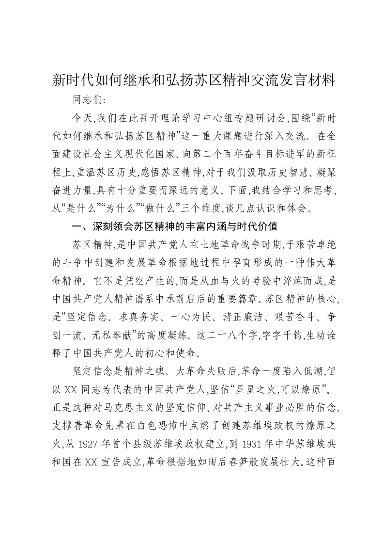 新时代如何继承和弘扬苏区精神交流发言材料同志们:今天,我们在此召开理论学习中心组专题研讨会,围绕“新时代如何继承和弘扬苏区精神”这一重大课题进行深入交流。在全面建设社会主义现代化国家、向第二个百年奋斗目标进军的新征程上,重温苏区历史,感悟苏区精神,对于我们汲取历史智慧、凝聚奋进力量,具有十分重要而深远的意义。下面,我结合学习和思考,从“是什么”“为什么”“做什么”三个维度,谈几点认识和体会。一、深刻领会苏区精神的丰富内涵与时代价值苏区精神,是中国共产党人在土地革命战争时期,于艰苦卓绝的斗争中创建和发展革命根据地过程中孕育形成的一种伟大革命精神。它不是凭空产生的,而是从血与火的考验中淬炼而成,是中国共产党人精神谱系中承前启后的重要篇章。苏区精神的核心,是“坚定信念、求真务实、一心为民、清正廉洁、艰苦奋斗、争创一流、无私奉献”的高度凝练。这二十八个字,字字千钧,生动诠释了中国共产党人的初心和使命。坚定信念是精神之魂。大革命失败后,革命一度陷入低潮,但以X同志为代表的中国共产党人,坚信“星星之火,可以燎原”。正是这种对马克思主义的坚定信仰、对共产主义事业必胜的信念,支撑着革命先辈在白色恐怖中点燃了创建苏维埃政权的燎原之火,从1927年首个县级苏维埃政权建立,到1931年中华苏维埃共和国在X宣告成立,革命根据地如雨后春笋般发展壮大。这种百折不挠、向死而生的坚定,是苏区精神最鲜明的底色。求真务是是活力之源。苏区时期,党面临着如何将马克思主义普遍真理与中国革命具体实践相结合的时代课题。X同志提出的“没有调查,就没有发言权”的著名论断,正是对当时盛行的教条主义的有力回击。党正是通过深入的调查研究,从中国农村的实际出发,才探索出一条“农村包围城市、武装夺取政权”的正确革命道路。这种坚持一切从实际出发的思想路线,是苏区精神的精髓所在。一心为民是宗旨之本。苏维埃政权是工农劳苦大众自己的政权,其根本宗旨就是全心全意为人民服务。苏区政府关心群众生活,注意工作方法,开展土地革命,废除苛捐杂税,让千百万被压迫的农民第一次拥有了自己的土地,真正成为了国家的主人。党与人民群众生死相依、患难与共,形成了牢不可破的血肉联系,这是苏区能够存在和发展的根本原因。清正廉洁是作风之基。在物质极度匮乏的环境下,党和苏维埃政府高度重视廉政建设,颁领布了中国共产党历史上第一个反腐败法令,严惩贪污浪费行为。时任X省苏维埃政府主席的X同志,在突围中身负重伤,宁愿沿途乞讨,也未动用分毫其保管的党的经费。这种克己奉公、清廉如水的政治本色,赢得了民心,巩固了政权。艰苦奋斗、争创一流、无私奉献是实践之要。苏区军民在敌人的严密封锁下,自力更生,发展生产,打破了一个个“不可能:在各