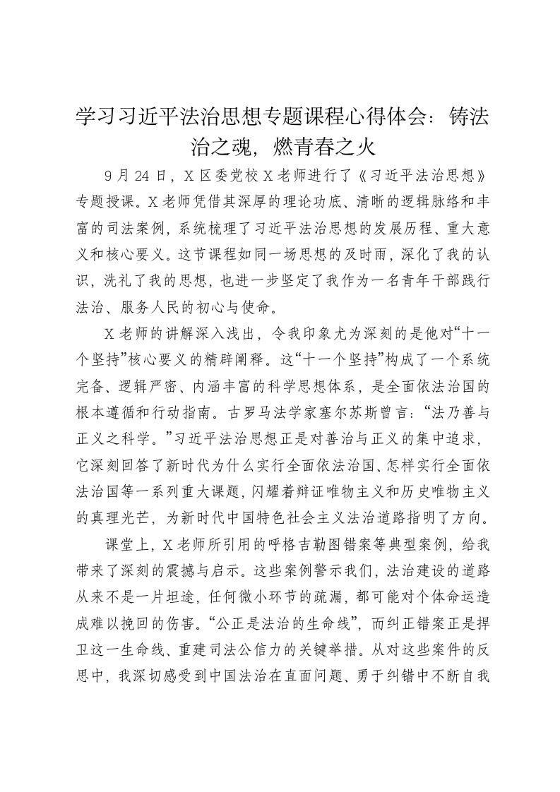 学习习近平法治思想专题课程心得体会:铸法治之魂,燃青春之火9月24日,X区委党校X老师进行了《习近平法治思想》专题授课。X老师凭借其深厚的理论功底、清晰的逻辑脉络和丰富的司法案例,系统梳理了习近平法治思想的发展历程、重大意义和核心要义。这节课程如同一场思想的及时雨,深化了我的认识,洗礼了我的思想,也进一步坚定了我作为一名青年干部践行法治、服务人民的初心与使命。X老师的讲解深入浅出,令我印象尤为深刻的是他对“十一个坚持”核心要义的精辟阐释。这“十一个坚持”构成了一个系统完备、逻辑严密、内涵丰富的科学思想体系,是全面依法治国的根本遵循和行动指南。古罗马法学家塞尔苏斯曾言:“法乃善与正义之科学。”习近平法治思想正是对善治与正义的集中追求,它深刻回答了新时代为什么实行全面依法治国、怎样实行全面依法治国等一系列重大课题,闪耀着辩证唯物主义和历史唯物主义的真理光芒,为新时代中国特色社会主义法治道路指明了方向。课堂上,X老师所引用的呼格吉勒图错案等典型案例,给我带来了深刻的震撼与启示。这些案例警示我们,法治建设的道路从来不是一片坦途,任何微小环节的疏漏,都可能对个体命运造成难以挽回的伤害。“公正是法治的生命线”,而纠正错案正是捍卫这一生命线、重建司法公信力的关键举措。从对这些案件的反思中,我深切感受到中国法治在直面问题、勇于纠错中不断自我完善、砥砺前行的勇气与决心。这也生动印证了总书记所强调的“努力让人民群众在每一个司法案件中感受到公平正义”绝不是一向空泛的口号,而是贯穿法治实践全过程的核心目标与不懈追求。作为一名身处基层的青年干部,我深感责任重大。我将把此次学习的成果转化为实际行动。一要争做学法遵法的表率。持续深入学习习近平法治思想及相关法律法规,将法治思想内化于心,始终保持对法律的敬畏,做到心有所畏、言有所戒、行有所止;二要争做守法用法的先锋。在日常工作中自觉运用法治思维和法治方式分析问题、推动工作、化解矛盾,特别是在结合X区实际开展工作时,确保各项要求和行动都在法治轨道上运行,保障人民群众的合法权益;三要争做法治信仰的播种人。积极向身边同事和群众宣传法治理念,引导大家依法办事、遇事找法、解决问题用法、化解矛盾靠法,共同营造遵法学法守法用法的良好社会氛围。“路漫漫其修远兮,吾将上下而求索。”习近平法治思想博大精深,非一日之功可以学深悟透。我将以此次学习为新的起点,持续加强理论武装,不断锤炼法治思维,努力提升依法履职能力,立志成为一名让党放心、让人民满意的忠诚、干净、担当的青年干部,为X区的高质量发展贡献自己的智慧和青春力量。