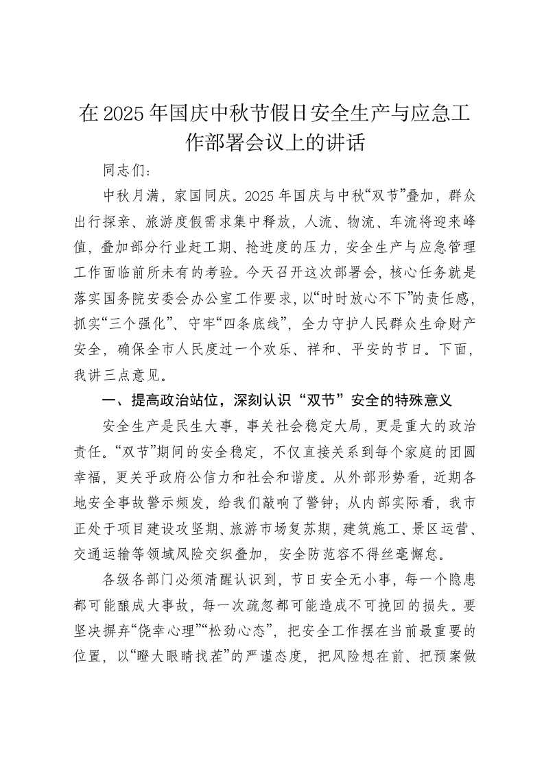 在2025年国庆中秋节假日安全生产与应急工作部署会议上的讲话同志们:中秋月满,家国同庆。2025年国庆与中秋“双节”叠加,群众出行探亲、旅游度假需求集中释放,人流、物流、车流将迎来峰值,叠加部分行业赶工期、抢进度的压力,安全生产与应急管理工作面临前所未有的考验。今天召开这次部署会,核心任务就是落实国务院安委会办公室工作要求,以“时时放心不下”的责任感,抓实“三个强化”、守牢“四条底线”,全力守护人民群众生命财产安全,确保全市人民度过一个欢乐、祥和、平安的节日。下面,我讲三点意见。一、提高政治站位,深刻认识“双节”安全的特殊意义安全生产是民生大事,事关社会稳定大局,更是重大的政治责任。“双节”期间的安全稳定,不仅直接关系到每个家庭的团圆幸福,更关乎政府公信力和社会和谐度。从外部形势看,近期各地安全事故警示频发,给我们敲响了警钟;从内部实际看,我市正处于项目建设攻坚期、旅游市场复苏期,建筑施工、景区运营、交通运输等领域风险交织叠加,安全防范容不得丝毫懈怠。各级各部门必须清醒认识到,节日安全无小事,每一个隐患都可能酿成大事故,每一次疏忽都可能造成不可挽回的损失。要坚决摒弃“侥幸心理“松劲心态”,把安全工作摆在当前最重要的位置,以“瞪大眼睛找茬”的严谨态度,把风险想在前、把预案做在前、把措施落在前,用我们的“辛苦指数”换取群众的“安全指数”“幸福指数”。二、聚焦关键环节,抓实“三个强化”筑牢安全防线(一)强化隐患排查,实现“动态清零”。隐患排查是防范事故的第一道防线,必须做到全面、精准、彻底。要聚焦重点领域开展“拉网式”排查:在建筑施工领域,严查抢工期、赶进度、冒险作业等行为,重点检查隧道、深基坑、脚手架等危大工程安全管理,严格分包队伍入场审核;在旅游安全领域,对景区索道、观光车等设施设备进行全检,合理控制游客流量,严防拥挤踩踏事故;在人员密集场所,整治电动自行车违规停放充电、消防通道堵塞、违规动火用电等突出问题;在危险化学品领域,紧盯生产、储存、运输全环节,强化重大危险源监控,保持“打非治违”高压态势。对排查出的隐患要建立台账,实行“销号管理”:能立即整改的当场整改;不能立即整改的,明确责任人和整改时限,派专人跟踪督办;对拒不整改或整改不到位的,坚决停产整顿、依法严惩。要形成“排查一整改一复查一销号”的闭环机制,确保隐患动态清零。(二)强化应急准备,提升“处置能力”。应急处置能力是守护安全的最后一道屏障,必须做到快速响应、高效处置。一要完善应急预案,结合“双节”特点,针对火灾、交通事故、危化品泄漏等突发事件,修订具有针对性、可操作性的专项预案,明确
